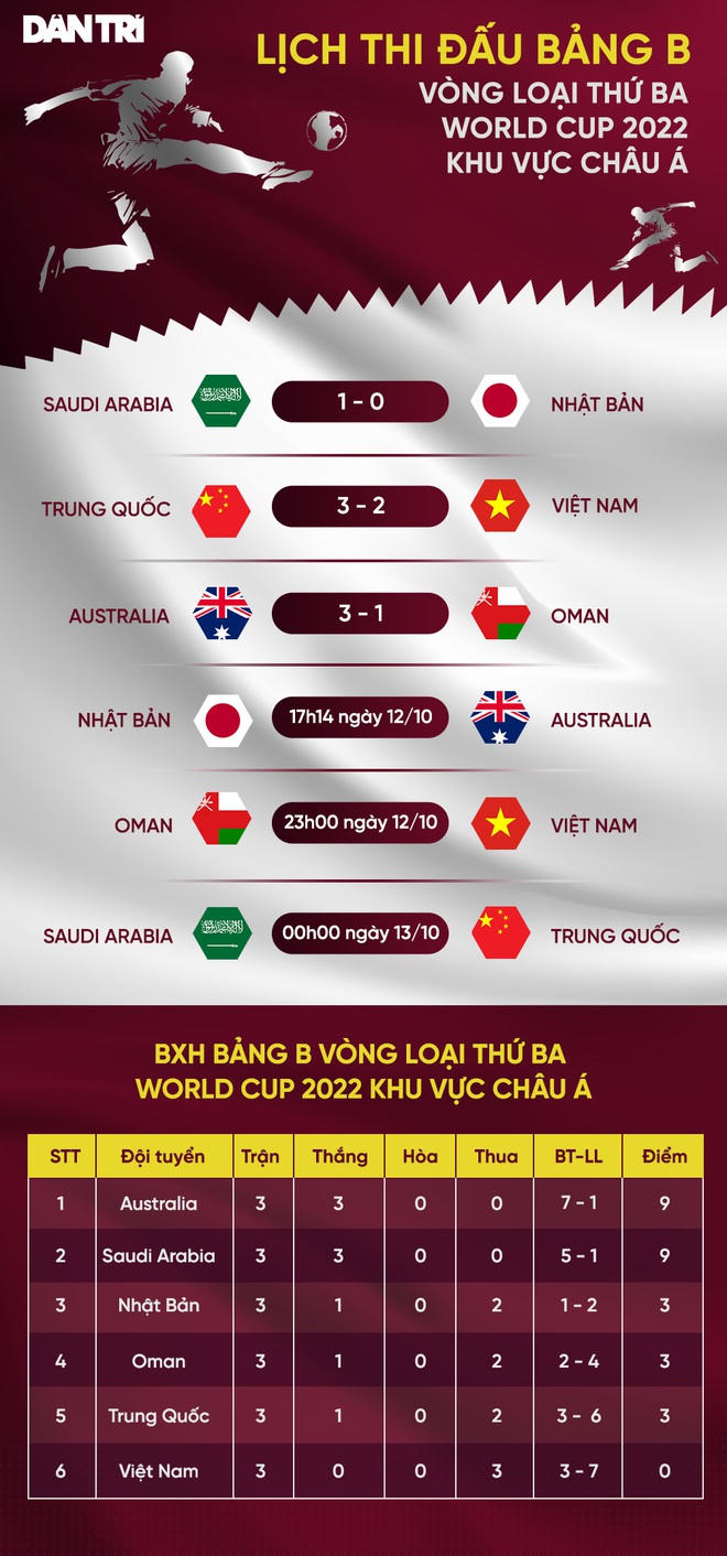 Với trận thua Trung Quốc, đội tuyển Việt Nam xếp cuối bảng B, vẫn chưa thể có điểm ở vòng loại cuối World Cup 2022 khu vực châu Á.
