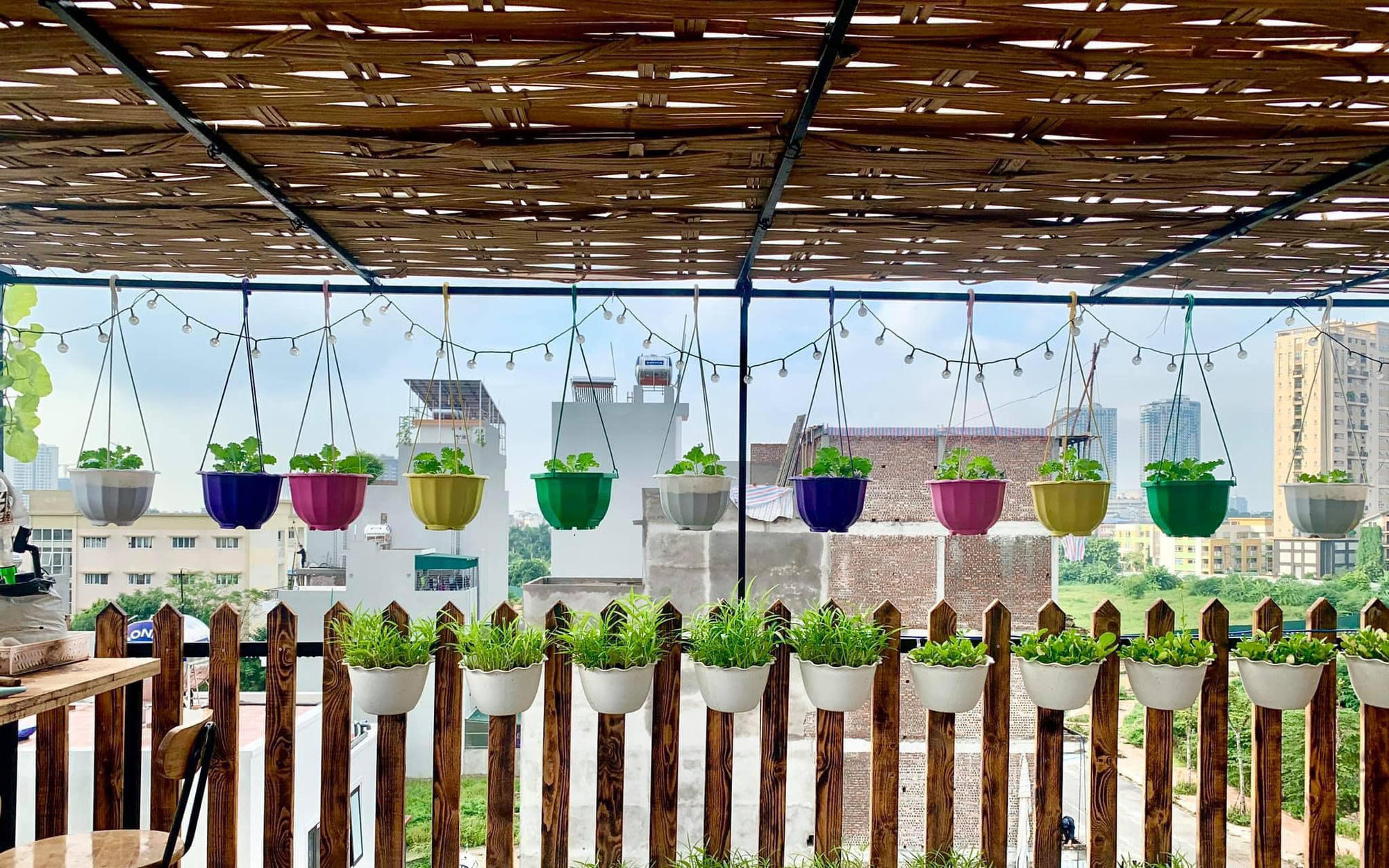 Còn ở sân thượng tầng 5, chị ưu tiên trồng rau vào các chậu treo và đặt ở đây những chiếc ghế gỗ thiết kế làm bàn bar… Với view cực lãng mạn này, sân vườn nhà chị chẳng thua kém một quán cafe ngoài trời nào khiến bất kỳ ai có dịp ghéo thăm gia đình chị đều phải trầm trồ về sân thượng đẹp mắt.