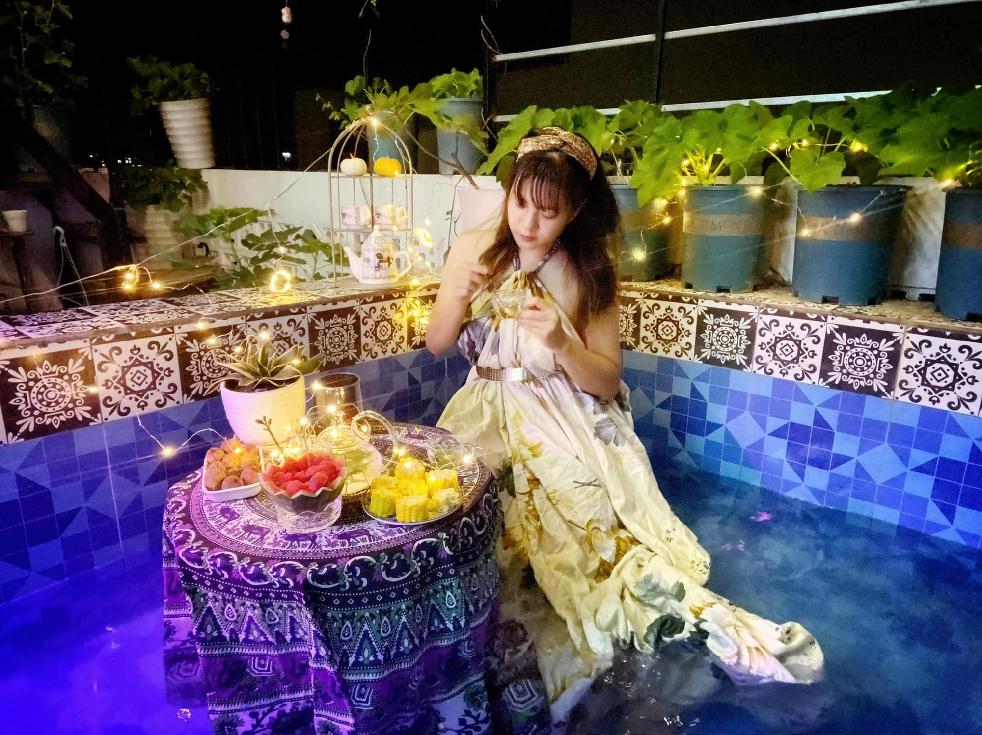 Buổi chiều cùng nhau bơi lội, cơm tối xong là cả gia đình kéo nhau lên sân thượng uống trà, ngắm trăng, tạm quên đi nỗi lo về dịch bệnh ở ngoài.