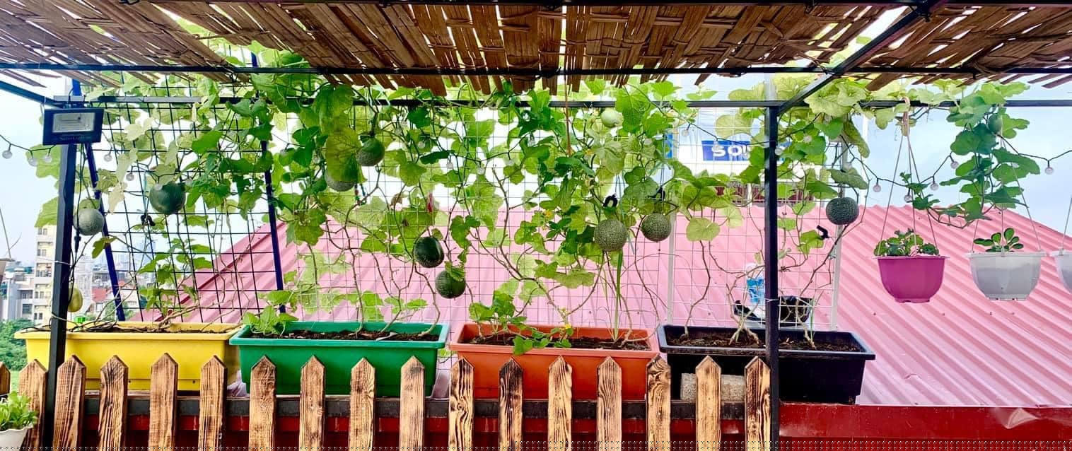 Sân thượng chỉ 30m2 nhưng chị Thùy Linh ( Hà Nội) đã tạo dựng thành vườn rau tươi tốt, lúc lỉu quả và thiết kế có quầy bar.