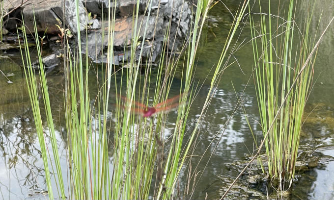 Diện trên mình bộ áo sặc sỡ, chú chuồn chuồn ớt nổi bật giữa những khóm cỏ xanh ven hồ, thong dong dạo chơi trong thế giới bình yên của riêng mình.
