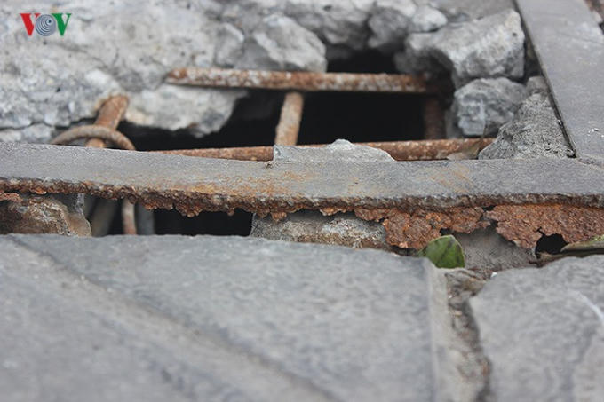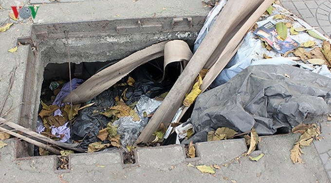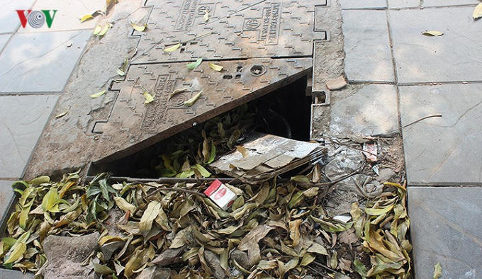 Trên vỉa hè Hà Nội có không ít những miệng cống, hố ga nằm chênh vênh, mất nắp, tạo thành những hố sâu đe dọa trực tiếp người đi bộ.