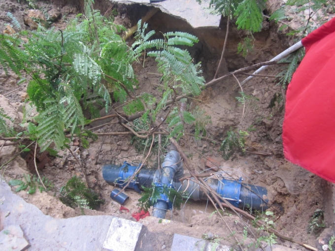 Đến hôm qua, sau nhiều ngày mưa lớn, “hố tử thần” tiếp tục xuất hiện lại và sụt lún rộng hơn, sâu gần 2m, rộng gần 4m. Phía trong hố chứa toàn nước, bùn đất và có một ống nước lớn chạy qua. Hai đầu miệng hố đang được đổ 2 đống cát, bên trên cắm nhiều cành cây cảnh báo người đi đường.