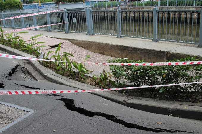 Tại hiện trường, vết nứt kéo liền từ bờ kè kênh Nhiêu Lộc - Thị Nghè ra tới hết 1 làn đường. Tạo nên một hố sâu với nhiều vết nứt.
