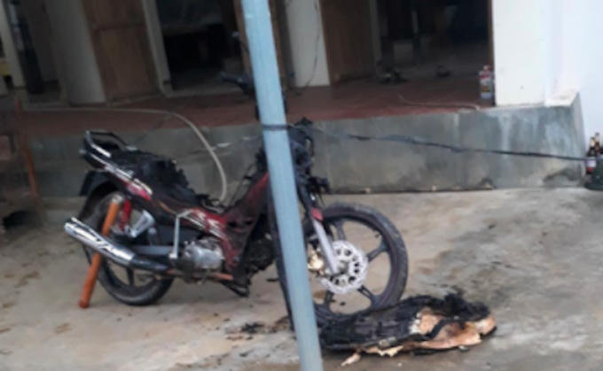 Hình ảnh chiếc xe máy bị cháy do Ngần phòng hoả đốt nhà.