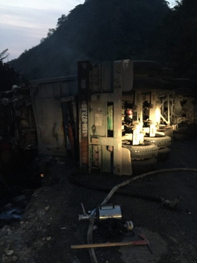 Tại hiện trường, hai chiếc xe đều bị biến dạng, nằm cách xa nhau, dầu tràn lan ra đường quốc lộ khiến giao thông ở đây ùn tắc nghiêm trọng.