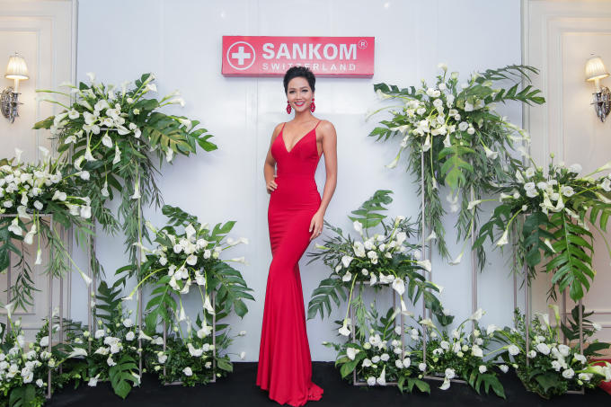 Hoa hậu H’hen Niê là Đại sứ Ra mắt thương hiệu Sankom từ Thuỵ Sĩ. Tại sự kiện, đại diện Miss Universe VN khoe dáng quyến rũ trong bộ đầm đỏ.