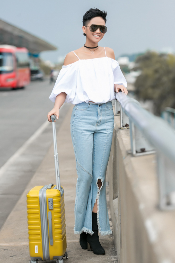Diện trang phục Elise theo phong cách Street Style năng động với áo hai dây trễ vai bèo màu trắng, kết hợp quần jeans ống loe khéo léo khoe đôi chân dài “ngút ngàn”, Hoa hậu H’Hen Niê tràn đầy năng lượng để sẵn sàng khám phá đất nước New Zealand xinh đẹp.