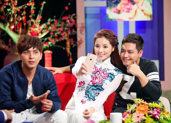 Diện tà áo dài trắng với họa tiết thêu nổi bật cùng khuôn mặt trang điểm nhẹ nhàng, Kỳ Duyên khoe nhan sắc ngày một xinh đẹp , nổi bật so với đêm đăng quang một năm về trước. Cô nàng vui vẻ chụp hình tự sướng bên ông bố ba con Phan Anh cùng hai ngôi sao nổi tiếng khác là nam ca sĩ Hồ Quang Hiếu và danh hài Tự Long.