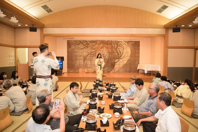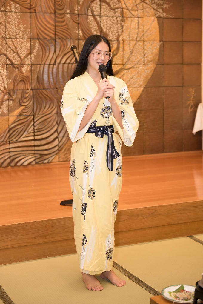 Người đẹp đã thể hiện ca khúc đình đám của nữ ca sĩ Chi Pu - Anh ơi ở lại và Vọng cổ buồn đậm chất miền Tây trong một bộ kimono nhẹ nhàng, đằm thắm khi dùng bữa tối.
