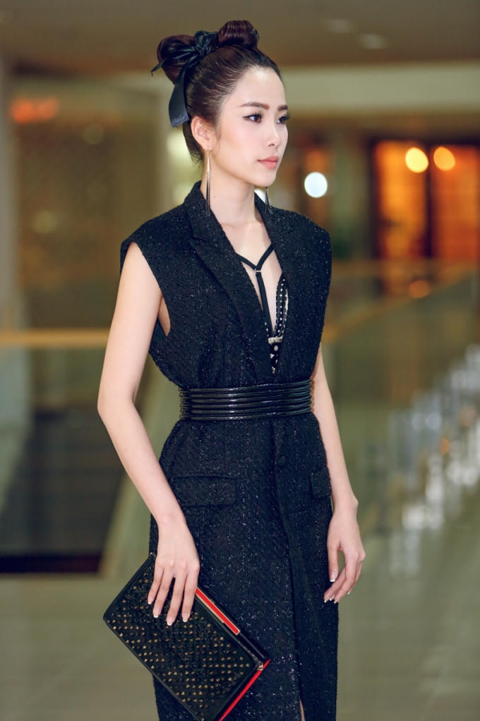 Diện bộ trang phục này, Nam Em cũng khéo léo lựa chọn kiểu tóc búi cao gọn gàng, thanh lịch và quý phái. Túi xách và giày cao gót của thương hiệu Christian Louboutin giúp cho Nam Em thêm phần sang trọng và đẳng cấp hơn.