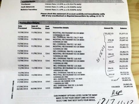 Số tiền được chủ nhà hàng báo lại với nhóm ông David Jonh là 13 triệu đồng theo hóa đơn. Do không đủ tiền mặt nên ông Jonh đã đưa thẻ Visa Card và Master Card cho nhân viên để chi trả.