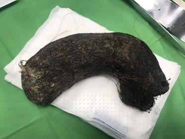 Hình ảnh búi tóc nặng 1kg lấy từ dạ dày bệnh nhân 11 tuổi.