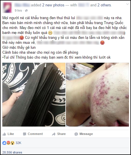 Không chỉ bán trôi nổi ở các ven đường, vỉa hè, những loại sản phẩm giá rẻ này còn được bán online tràn lan trên các trang mạng điện tử. Thông tin về loại khẩu trang này càng trở nên rầm rộ hơn khi 1 bạn trẻ đăng lên trang cá nhân của mình tấm ảnh ảnh gương mặt bị nổi mụn rất nhiều, có chỗ còn lở loét khi sử dụng 'khẩu trang y tế' đen. Hình ảnh này ngay lập tức được cư dân mạng quan tâm, chia sẻ và bày tỏ sự e ngại đáng kể.