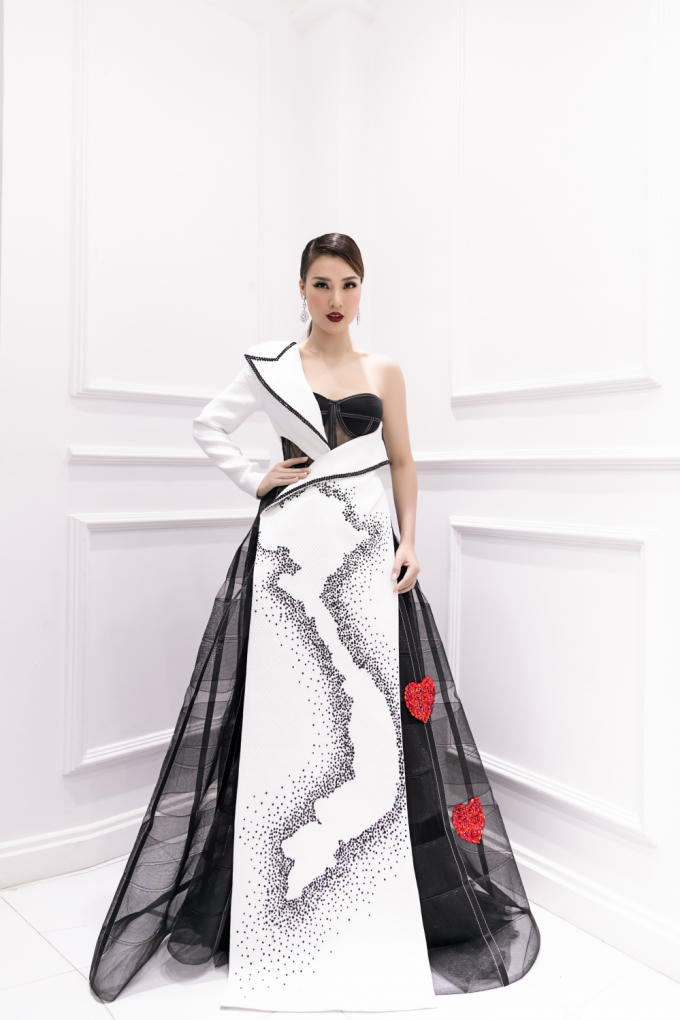 Với hai tông màu đen trắng, chiếc váy khiến người xem chú ý bởi chi tiết bản đồ Việt Nam cùng hai trái tim đỏ đại diện cho quần đảo Trường Sa và Hoàng Sa. Hoàng Oanh cho biết ngay từ khi nhận được mẫu thiết kế, bản thân cô đã rất yêu thích và muốn diện trong một sự kiện trang trọng để truyền tải thông điệp, tình yêu và niềm tự hào dân tộc đến tất cả mọi người.