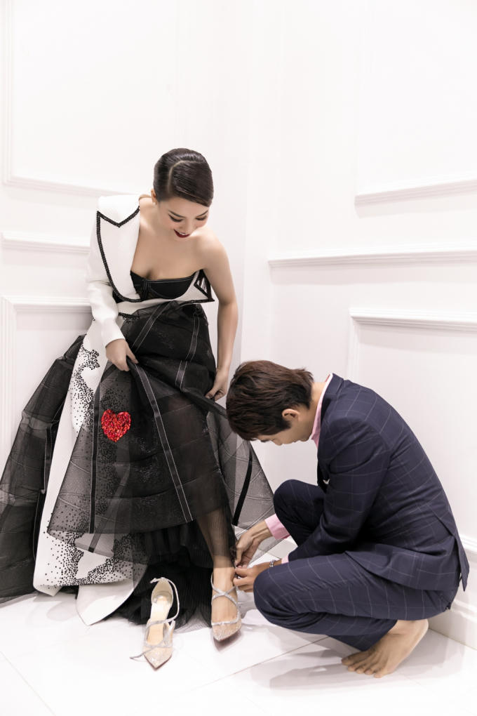 Diện trang phục của NTK Nguyễn Tiến Truyển, Hoàng Oanh ghi điểm với vẻ ngoài cá tính khi xuất hiện trên thảm đỏ chương trình. Được biết, trang phục lần này được NTK và stylist Kye Nguyễn "đo ni đóng giày" cho Dung đại ca.