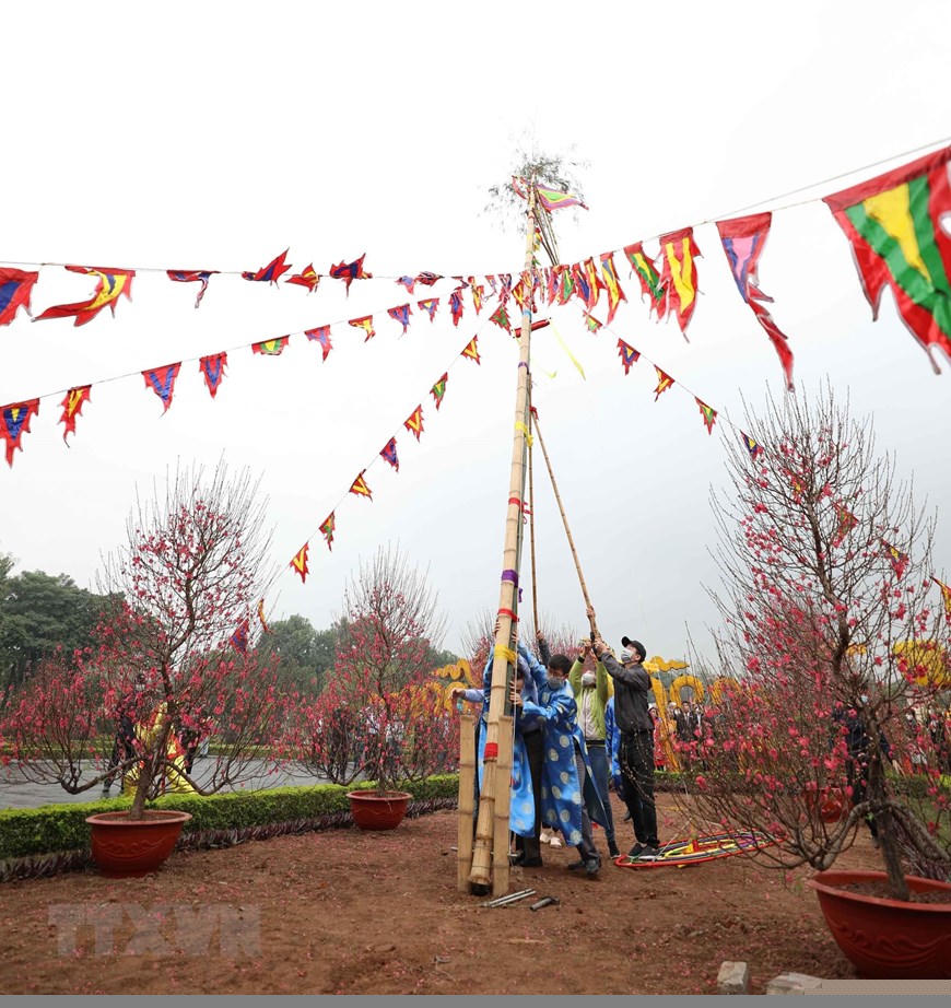 Cây nêu ngày Tết được dựng trong khu di sản thế giới Hoàng Thành Thăng Long. (Ảnh: Thanh Tùng/TTXVN)