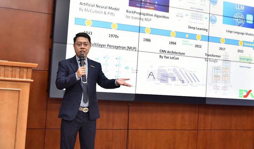 Trong phần trình bày của mình, ông đã cung cấp một bức tranh toàn cảnh về lịch sử hình thành và các giai đoạn phát triển của Trí tuệ nhân tạo nói chung, làm rõ bản chất của các mô hình ngôn ngữ lớn (Large Language Models), tầm quan trọng của dữ liệu trong kỷ nguyên mới, và cách thức Trí tuệ nhân tạo tạo sinh đang tái định hình mạnh mẽ ngành tài chính - ngân hàng quốc tế cũng như tại Việt Nam.