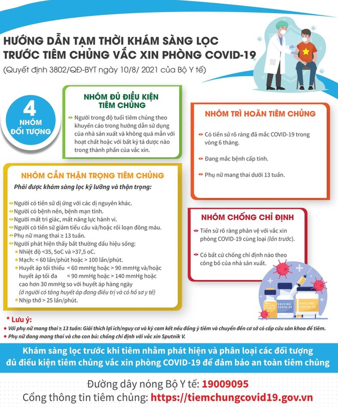 Ngày 10/8 Bộ Y tế ban hành Quyết định 3802/QĐ-BYT về Hướng dẫn tạm thời Khám sàng lọc trước khi tiêm vắc xin phòng Covid-19, trong đó có bổ sung, điều chỉnh một số nhóm đối tượng trong khám sàng lọc trước tiêm chủng vắc xin phòng Covid-19.