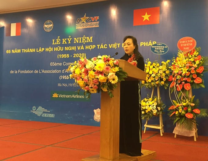 Phát biểu chào mừng lễ kỷ niệm, Chủ tịch Hội Hữu nghị và Hợp tác Việt Nam – Pháp, PGS. TS. Nguyễn Thị Kim Tiến nêu rõ, Hội Hữu nghị Việt - Pháp đến nay đã trải qua 65 năm hoạt động với mục tiêu “góp phần tăng cường sự hiểu biết lẫn nhau và tình hữu nghị giữa nhân dân hai nước Việt Nam và Pháp; đóng góp vào việc phát triển không ngừng quan hệ giữa hai nước, vì hòa bình, hợp tác và phát triển”.