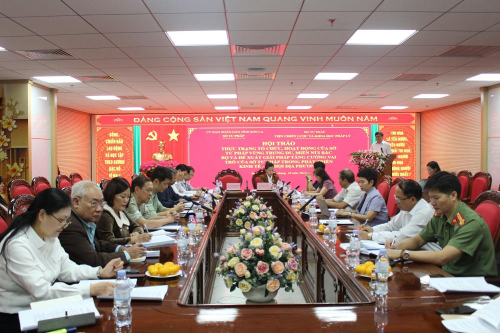 Ngày 25/10, Viện Chiến lực và Khoa học pháp lý (Bộ Tư pháp) phối hợp với Sở Tư pháp tỉnh Sơn La tổ chức Hội thảo thực trạng tổ chức, hoạt động của Sở Tư pháp vùng trung du, miền núi phía Bắc Bộ và đề xuất giải pháp tăng cường vai trò của Sở Tư pháp trong phát triển kinh tế - xã hội địa phương .