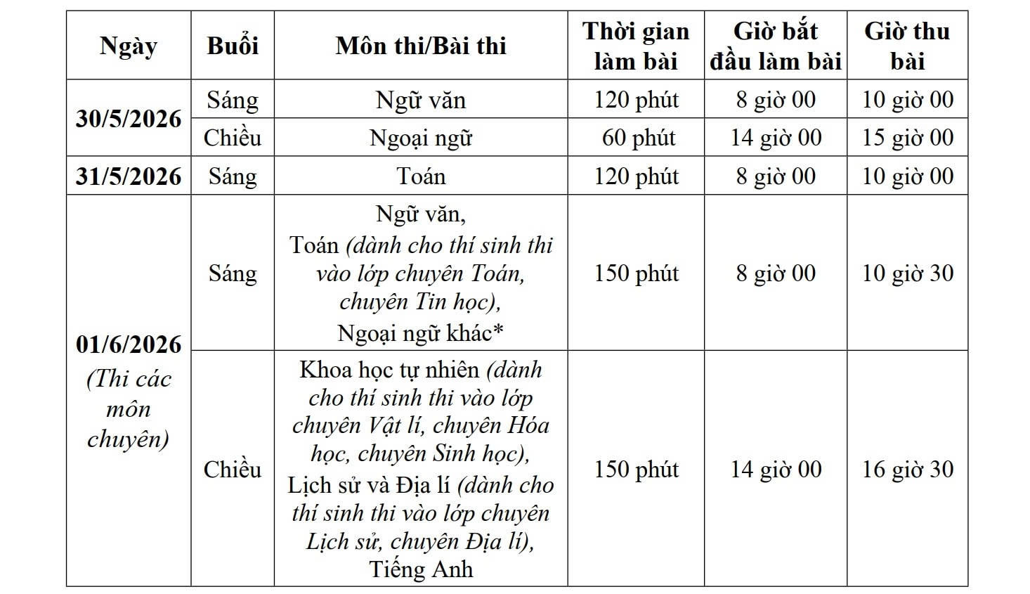 Kỳ thi tuyển sinh lớp 10 năm nay sẽ diễn ra trong hai ngày 30 và 31/5. Trước đó, vào 9h ngày 29/5, thí sinh sẽ đến điểm thi để học quy chế, kiểm tra thông tin dự thi. Những thí sinh đăng ký vào trường chuyên sẽ thi thêm môn chuyên vào ngày 1/6.