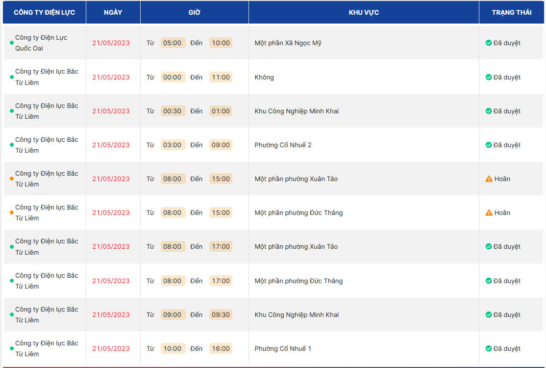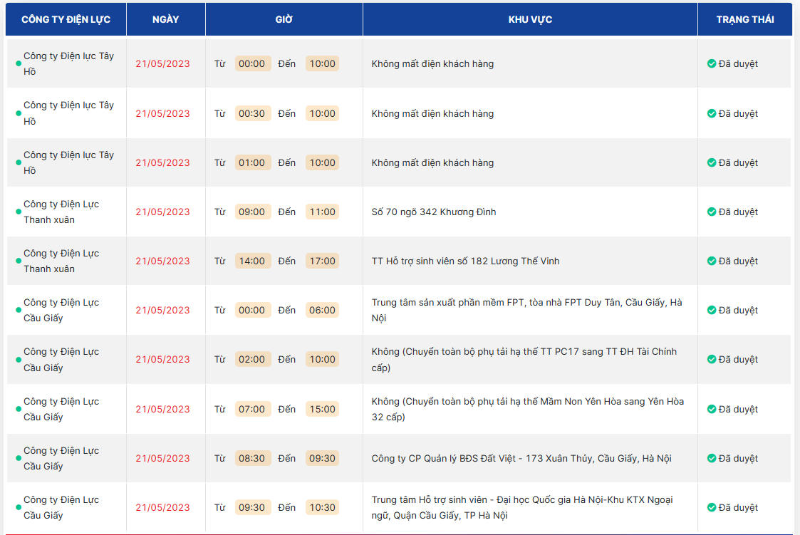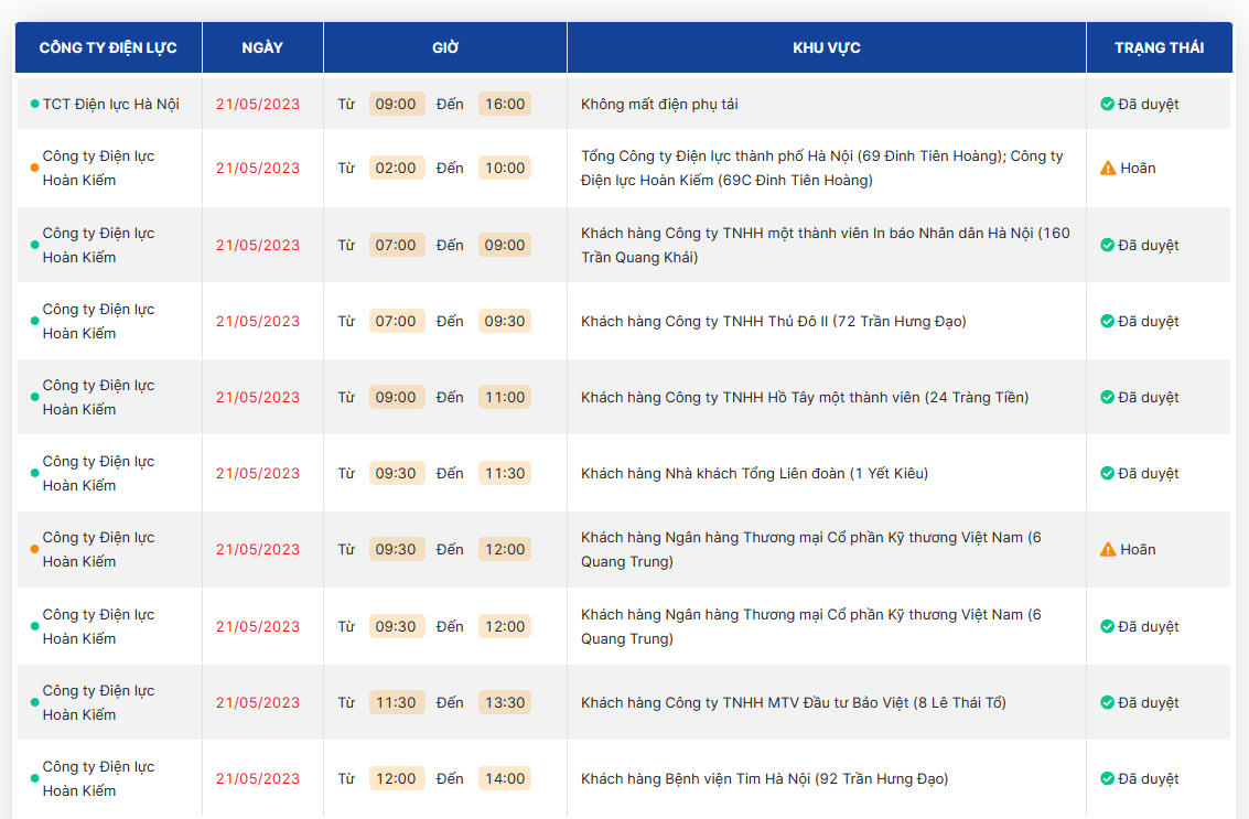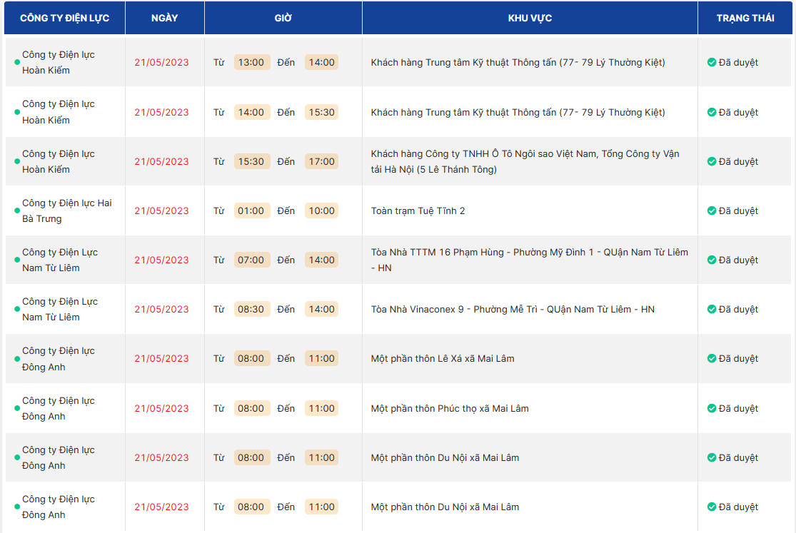 Danh sách cụ thể các vụ vực tạm ngừng cấp điện trên địa bàn TP Hà Nội trong ngày 21/5 được EVNHANOI công bố cụ thể như sau: