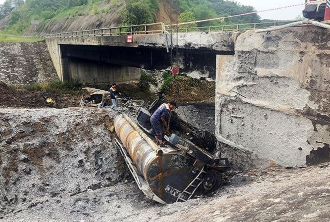 Nhiệt độ cao từ vụ cháy xe xitec đã ảnh hưởng lớn đến kết cấu bê tông của cầu Ngòi Thủ.