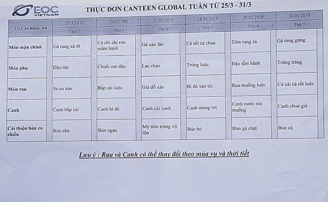 Được biết, bếp ăn tập thể của Công ty TNHH Great Global International do Công ty TNHH Việt Nam EOC đảm nhiệm phục vụ thường xuyên gần 1.900 suất ăn trưa/ngày và khoảng 300 suất ăn tăng ca, mỗi xuất ăn trị giá 15.000 đồng. Thực đơn bữa trưa 26/3 gồm: Cá chi chi rim mắm hành, chuối om đậu, bắp cải luộc, canh bí đỏ.