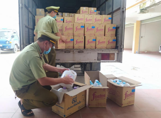 Tiến hành kiểm tra, lực lượng chức năng phát hiện trên xe chở 352 can nước giặt nhãn hiệu D-nee và 712 can nước giặt nhãn hiệu FineLine do nước ngoài sản xuất.