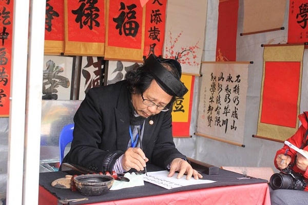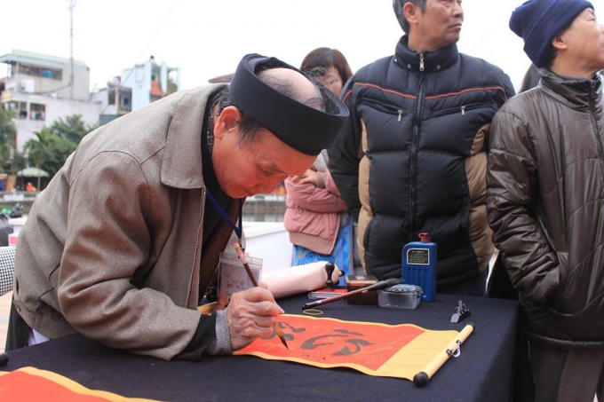 | Ông đồ đang thể hiện những nét chữ mềm mại, trang nhã tại Hội chữ Xuân Bính Thân 2016.( Ảnh: Như Trường). |