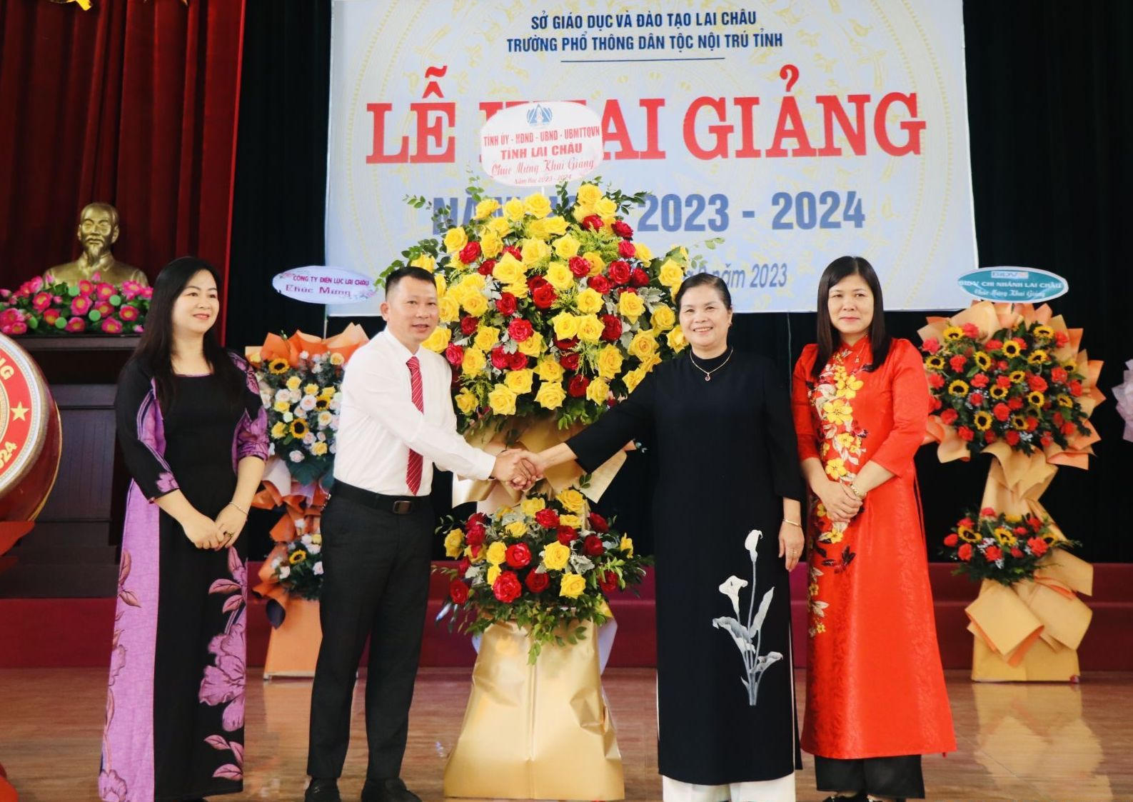 Bí thư Tỉnh uỷ Giàng Páo Mỷ tặng lẵng hoa chúc mừng cho tập thể Trường Phổ thông dân tộc nội trú tỉnh. Ảnh: BLC