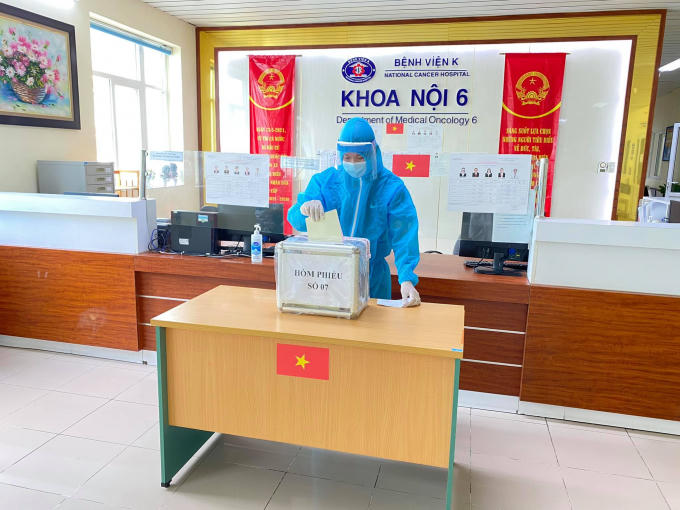 Tại Bệnh viện K, việc đảm bảo an toàn cho hơn 2.200 người bệnh, người nhà người bệnh, cán bộ y tế, người lao động đang cách ly tại bệnh viện bầu cử là nhiệm vụ quan trọng hàng đầu, chính vì vậy bệnh viện tổ chức bỏ phiếu theo từng giờ, từng khoa, trong mỗi khoa lại tổ chức theo từng buồng bệnh, buồng bệnh này bỏ phiếu xong rồi mới đến buồng bệnh khác; Những bệnh nhân nặng không đi lại được sẽ bỏ phiếu tại giường bệnh.