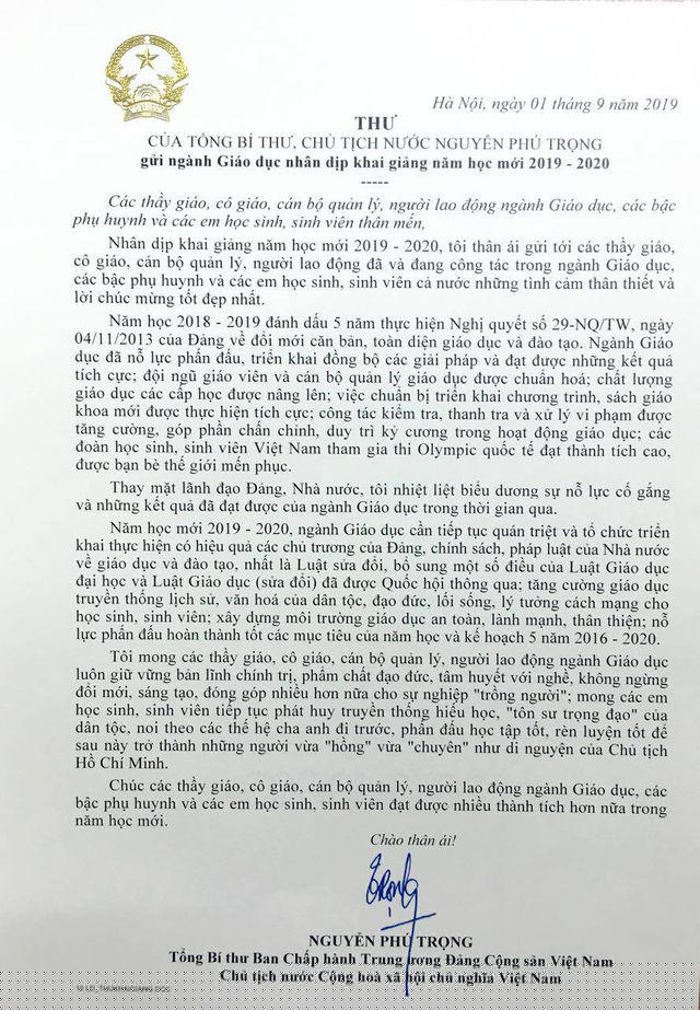 Thư chúc mừng năm học mới của Tổng Bí thư, Chủ tịch nước Nguyễn Phú Trọng.