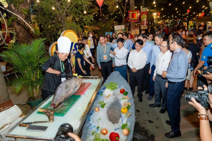 Đầu bếp chế biến cá ngừ trực tiếp tại lễ hội ẩm thực