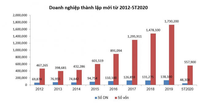 Bên cạnh đó, còn có 21,7 nghìn doanh nghiệp quay trở lại hoạt động, tăng 10,5% so với 5 tháng đầu năm 2019, nâng tổng số doanh nghiệp thành lập mới và doanh nghiệp quay trở lại hoạt động trong 5 tháng lên 70 nghìn doanh nghiệp, trung bình mỗi tháng có 14 nghìn doanh nghiệp thành lập mới và quay trở lại hoạt động.