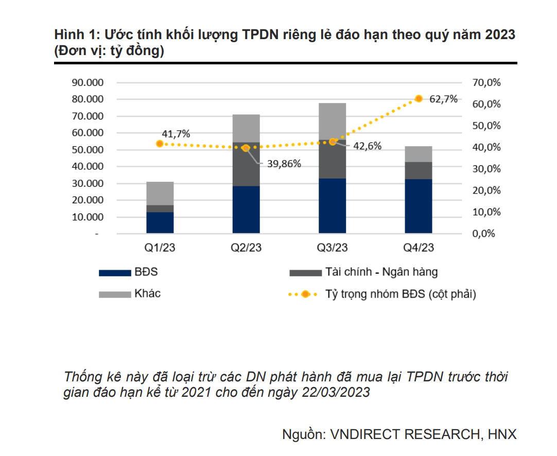 Trong năm 2023, VNDirect ước tính giá trị đáo hạn trái phiếu doanh nghiệp sẽ rơi vào khoảng 232,6 nghìn tỷ đồng, tăng 51,6% so với cùng kỳ.