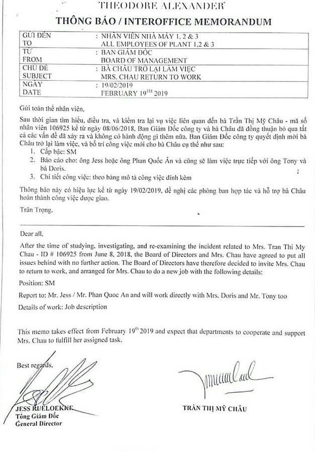 "Sau thời gian tìm hiểu, điều tra và kiểm tra lại vụ việc, Ban giám đốc Công ty Theodore Alexander quyết định mời bà Châu trở lại làm việc..."