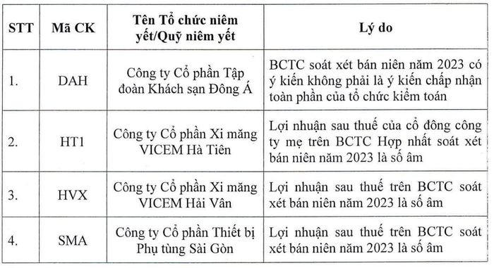 Cụ thể, cổ phiếu DAH của CTCP Tập đoàn Khách sạn Đông Á không đủ điều kiện giao dịch ký quỹ do BCTC soát xét bán niên năm 2023 có ý kiến không phải là ý kiến chấp nhận toàn phần của tổ chức kiểm toán.