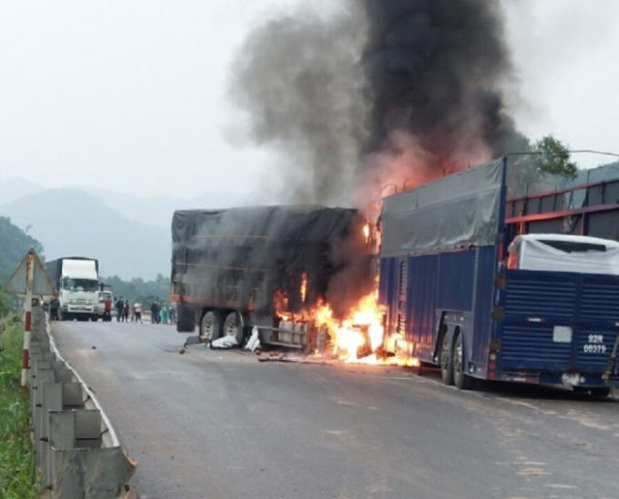 2 chiếc xe tải chạy ngược chiều nhau trên Quốc lộ 1A tuyến tránh (TP Huế, tỉnh Thừa Thiên - Huế) thì xảy ra va chạm rồi bốc cháy dữ dội .