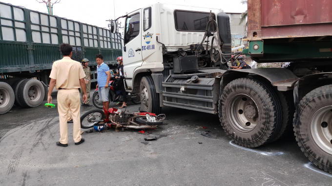 Khi đến giao lộ đường số 14 (phường Linh Trung, quận Thủ Đức) thì bất ngờ bị xe container biển số 51C-491.68 chạy cùng chiều bên trái đang rẽ phải vào đường số 14 tông trúng.