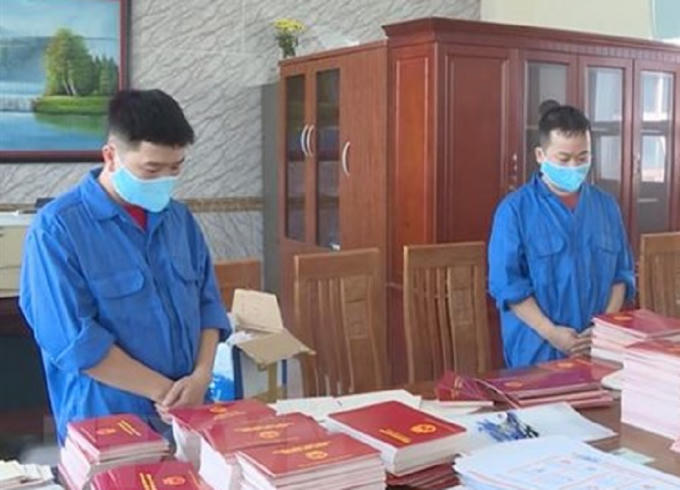 Qua khám xét khẩn cấp chỗ ở của hai đối tượng trên, Công an thu giữ 3 máy tính, 1 máy in màu, 1 máy sấy dấu, 1 dụng cụ dập dấu, 205 hình dấu các loại của các cơ quan, tổ chức trên nhiều tỉnh thành trong cả nước, 1.100 phôi văn bằng chứng chỉ giả và nhiều tài liệu liên quan đến việc làm văn bằng, giấy tờ, tài liệu giả.