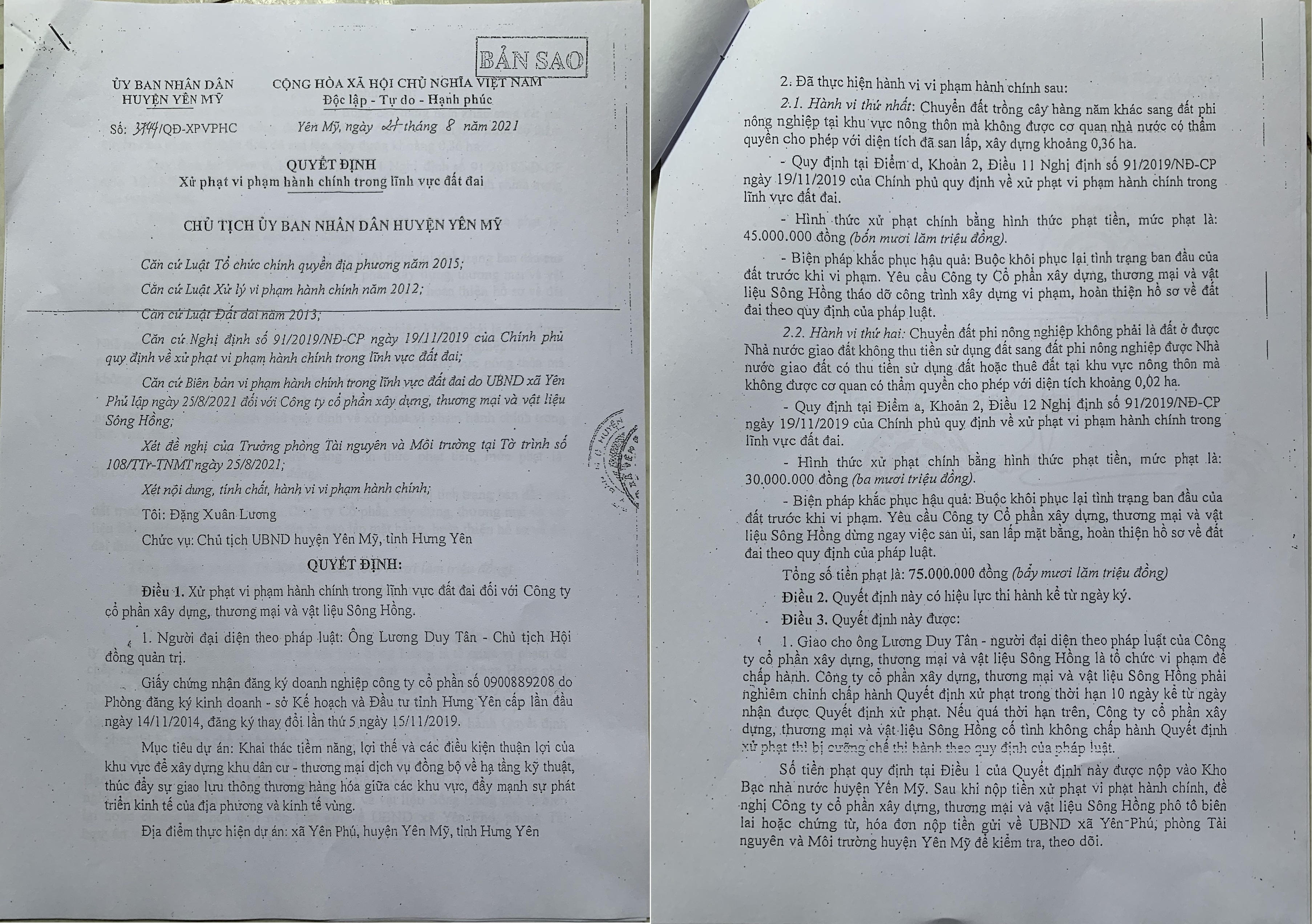 Chủ tịch UBND huyện Yên Mỹ ra Quyết định xử phạt vi phạm hành chính trong lĩnh vực đất đai đối với Công ty cổ phần xây dựng, thương mại và vật liệu Sông Hồng.
