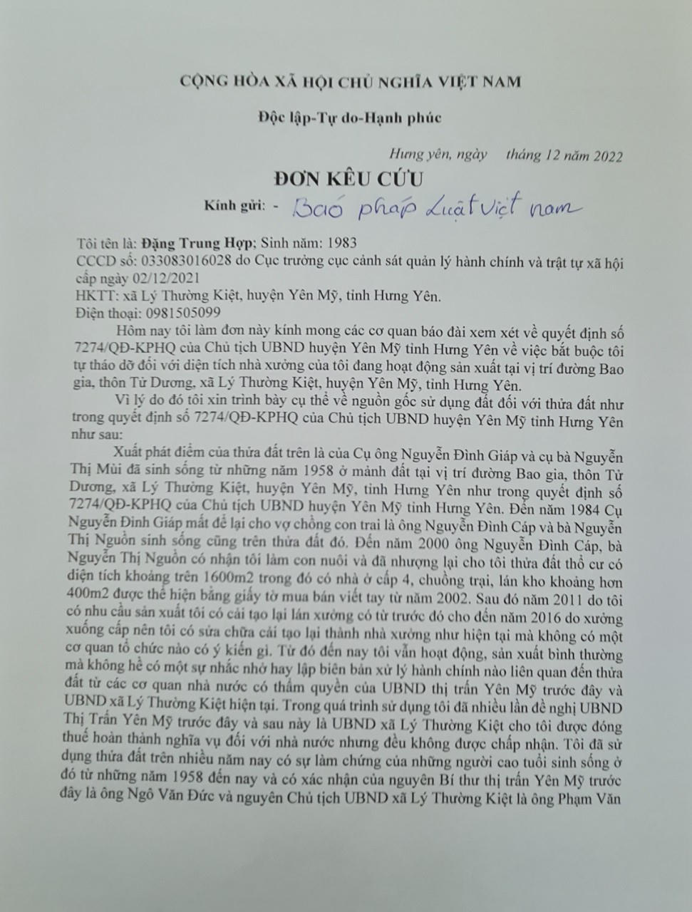 Nội dung đơn thư anh Hợp nêu "Tôi làm đơn này kính mong các cơ quan báo đài xem xét về quyết định số 7274/QĐ-KPHQ của Chủ tịch UBND huyện Yên Mỹ, tỉnh Hưng Yên về việc bắt buộc tôi tự tháo dỡ đối với diện tích nhà xưởng đang hoạt động sản xuất tại vị trí đường Bao Gia, thôn Tử Dương, xã Lý Thường Kiệt, huyện Yên Mỹ, tỉnh Hưng Yên".