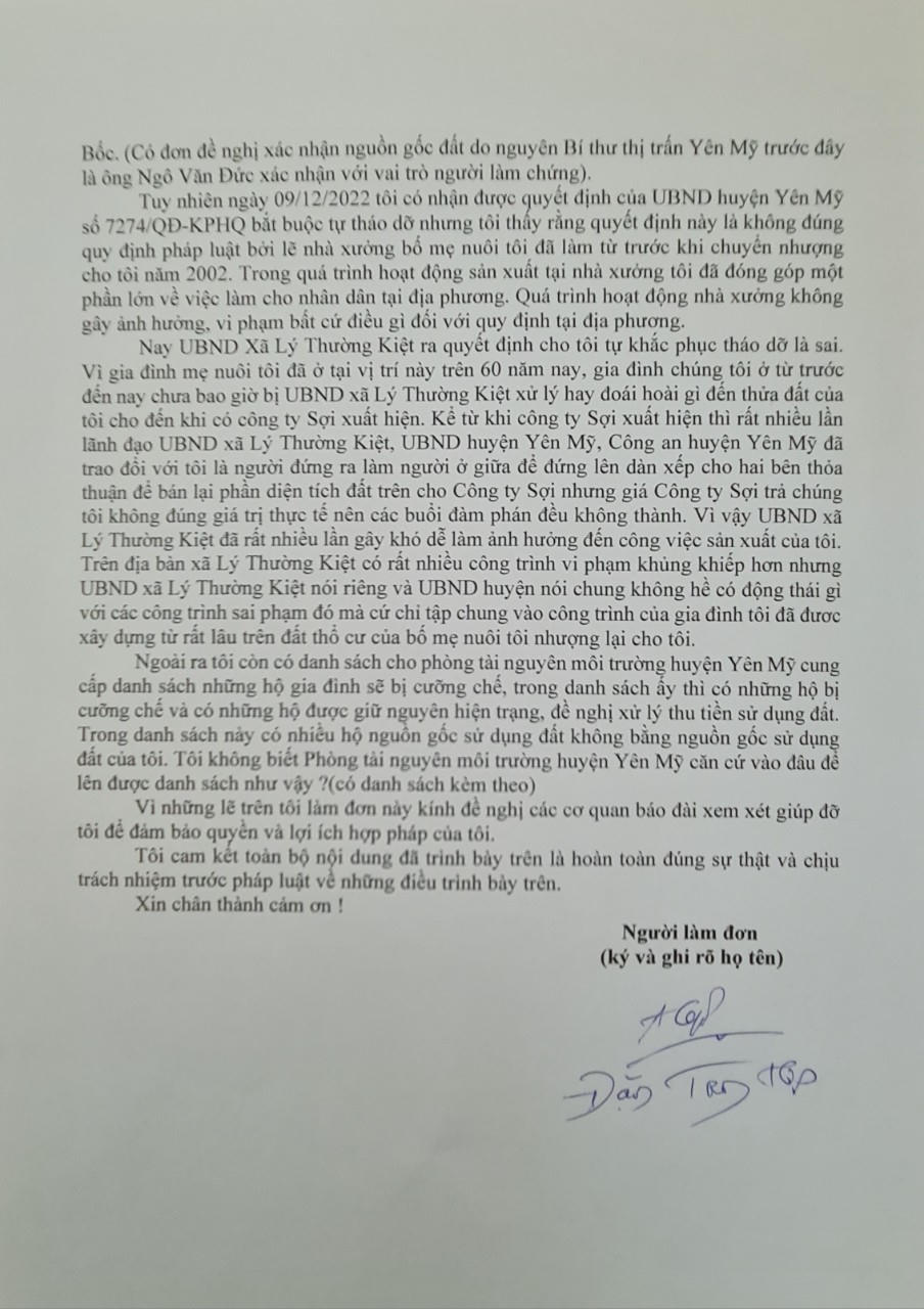 Nay Chủ tịch UBND huyện Yên Mỹ ra quyết định cho tôi tự khắc phục tháo dỡ là sai, vì gia đình mẹ nuôi tôi đã ở tại vị trí này trên 60 năm nay, gia đình ở từ trước đến nay chưa bao giờ bị UBND huyện Yên Mỹ nói chung và UBND xã Lý Thường Kiệt nói riêng xử lý hay đoái hoài gì đến thửa đất của tôi cho đến khi có một doanh nghiệp sợi xuất hiện.