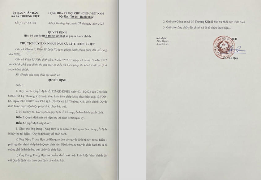 "UBND xã Lý Thường Kiệt ban hành Quyết định số 127/QĐ-KPHQ là trái thẩm quyền. Do đó, ngày 7/12/2022, ông Vũ Văn Quý, Chủ tịch UBND xã Lý Thường Kiệt ký ban hành quyết định số 144/QĐ-HB về việc huỷ bỏ Quyết định số 127/QĐ-KPHQ với lý do "Do vi phạm quy định về thẩm quyền ban hành quyết định".
