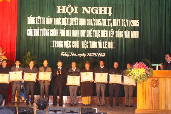Theo đó, 10 năm thực hiện nếp sống văn minh trong việc cưới tang, lễ hội và trao tặng 91 bằng khen cho các cá nhân, tập thể, hộ gia đình tiêu biểu trong công tác thực hiện.