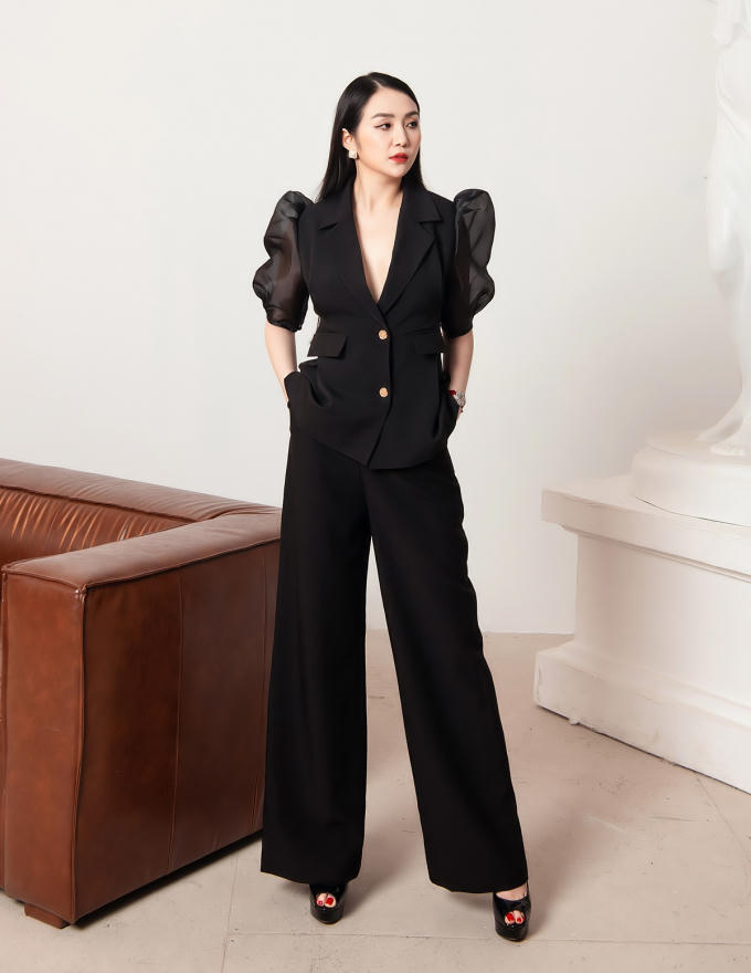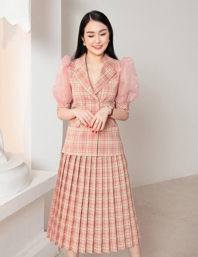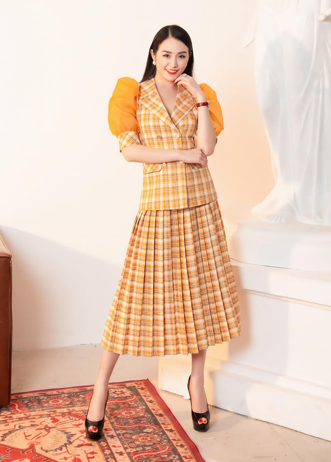 Những chiếc đầm xòe, tay bồng, váy giả vest khắc họa hình tượng quý cô sang trọng, duyên dáng. Cô cũng chú trọng sử dụng chất liệu không nhăn để trang phục luôn giữ được trọn vẹn sức hút.
