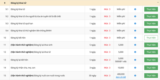 Bước 3: Trong mục hộ tịch, bạn kéo xuống dưới dòng “đăng ký kết hôn” và ấn “thực hiện”.