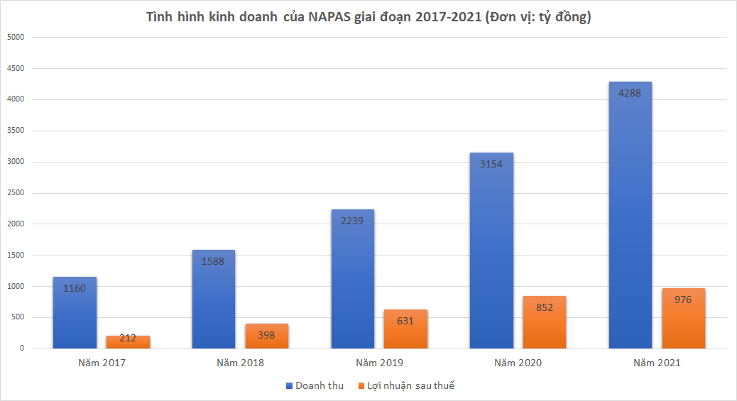 Lợi nhuận của NAPAS năm 2017 ghi nhận mức hơn 200 tỷ đồng. Con số này tăng gần gấp đôi vào năm 2018 và gấp gần 5 lần vào năm 2021, đạt gần 980 tỷ đồng. Tính trung bình trong năm 2021, mỗi ngày NAPAS "bỏ túi" hơn 2,6 tỷ đồng.